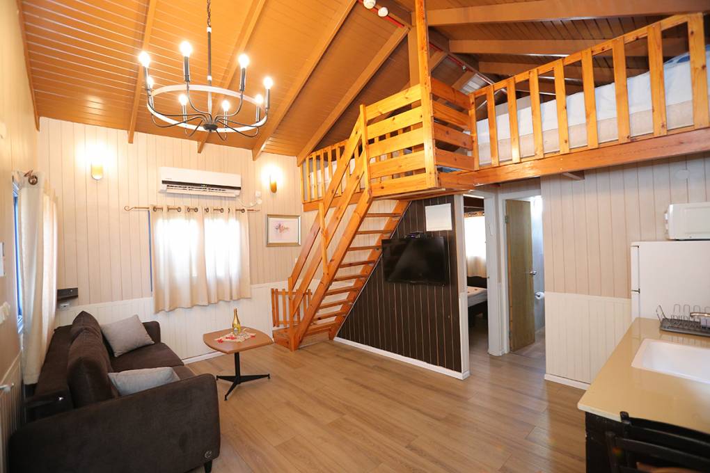 בקתות מאובזרות ומוקפדות הכוללות סלון עם ספה נפתחת, חדר שינה זוגי, קומת גלריה עם 4 מיטות יחיד, טלוויזיה בחיבור לכבלים, חדר רחצה עם מגבות ותחליבים, מכונת כביסה, מטבחון מאובזר בכיריים, מקרר, פינת קפה, מיקרוגל, כלי בישול ואוכל. לכל בקתה מרפסת פרטית עם פינת מנגל.