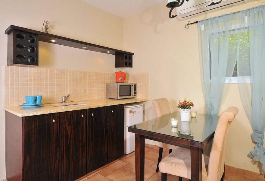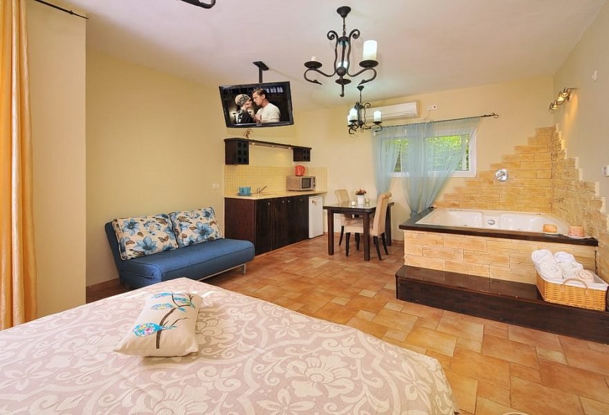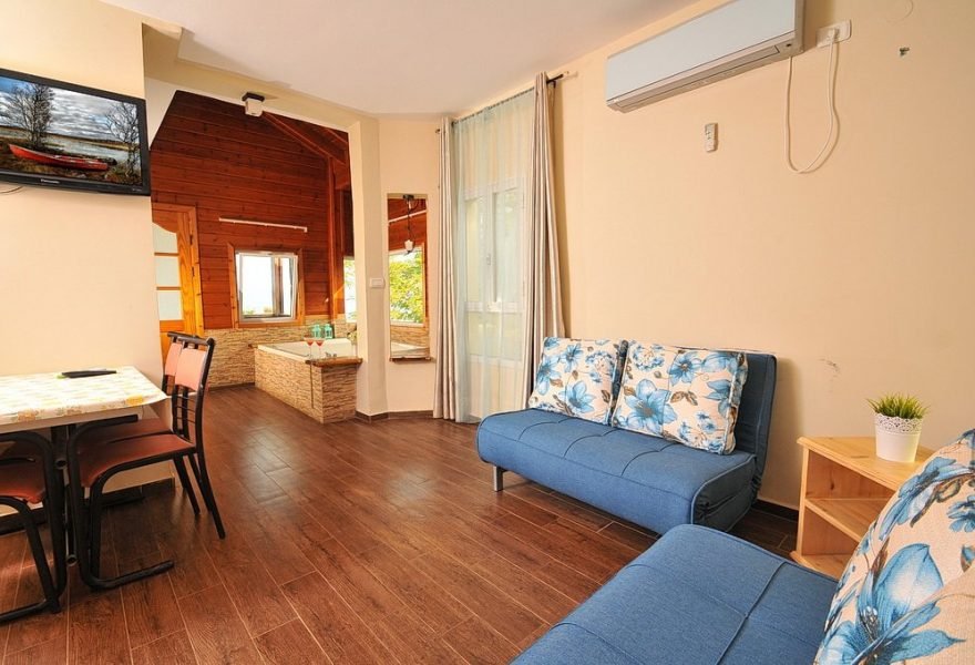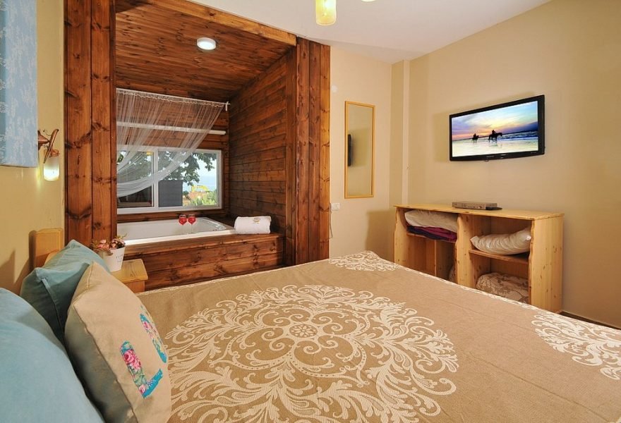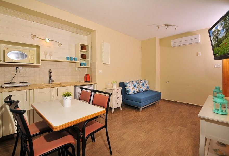 סוויטה נעימה ומרווחת עם מרפסת פרטית, מעוצבת כחלל פתוח הכוללת מיטה זוגית, ספת יחיד, ג'קוזי פרטי, חדר רחצה עם מגבות ותחליבים, טלוויזיה חכמה בחיבור לכבלים. מטבח מאובזר בכיריים, מקרר, פינת קפה, מיקרוגל, כלי בישול ואוכל.